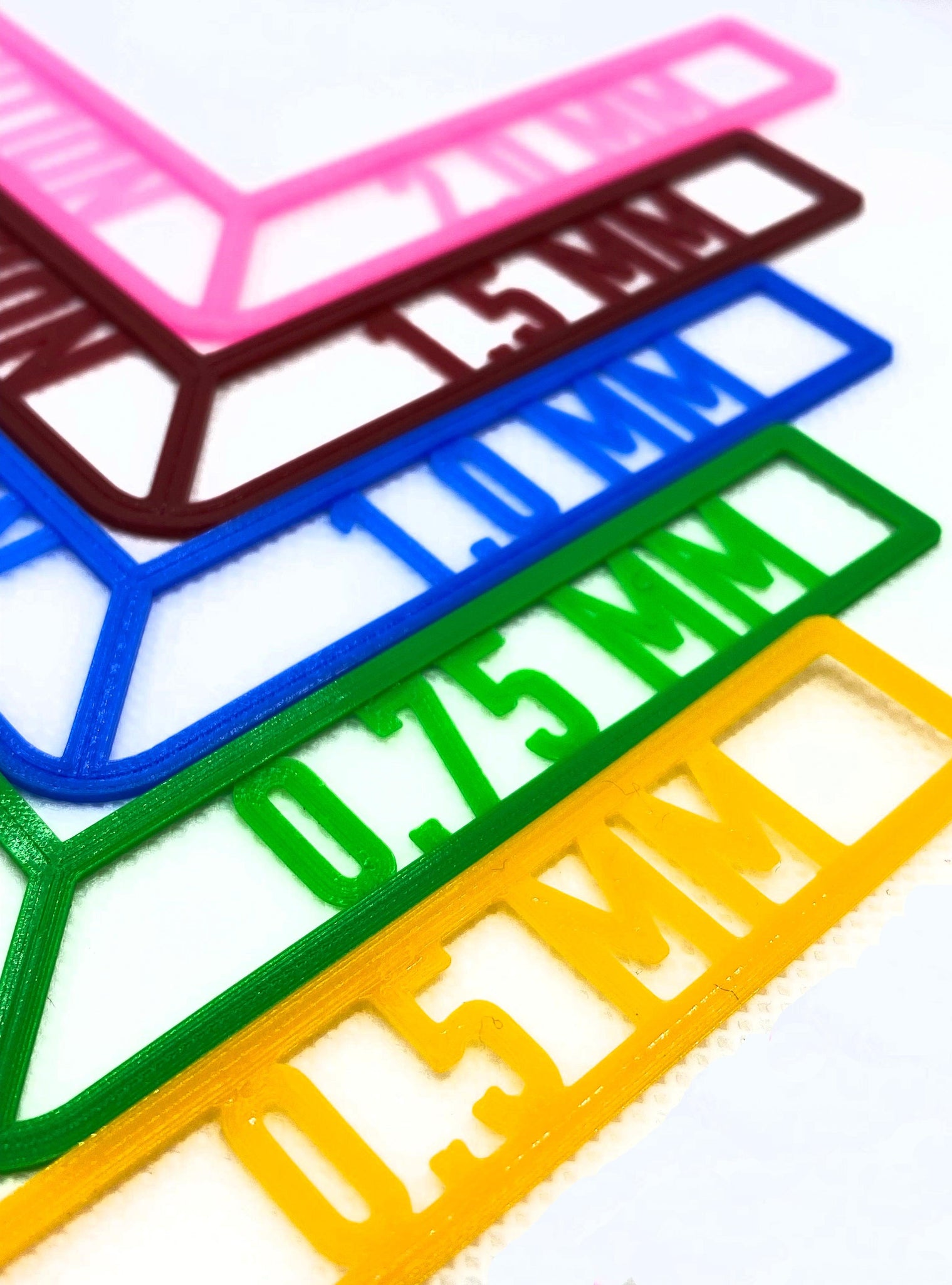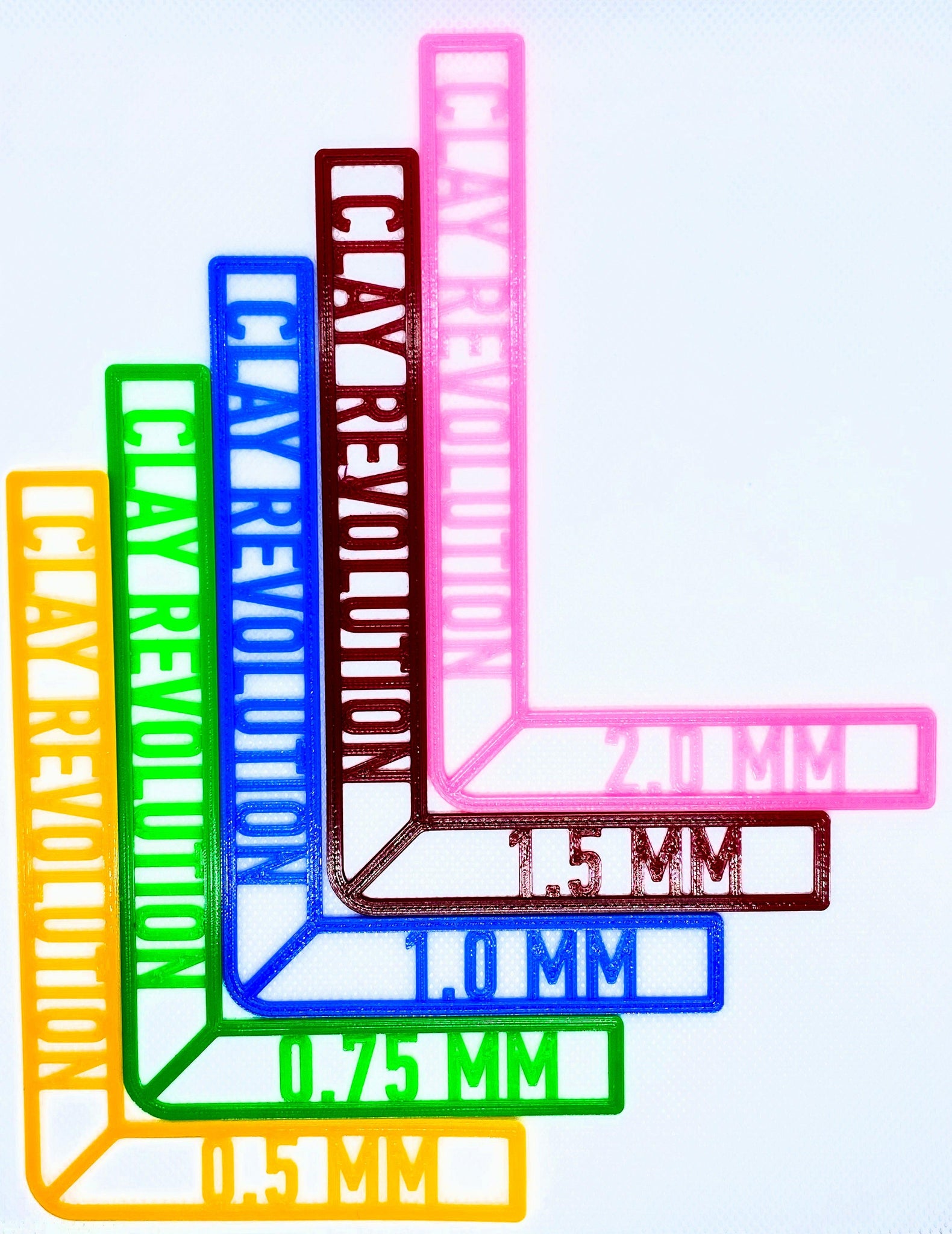 Adjustable Rolling Gauges come in 5 thicknesses. Use them to roll clay as thin as .5mm and as thick as 5.75mm thick. Each size is color coded to make selection easy while you are working.