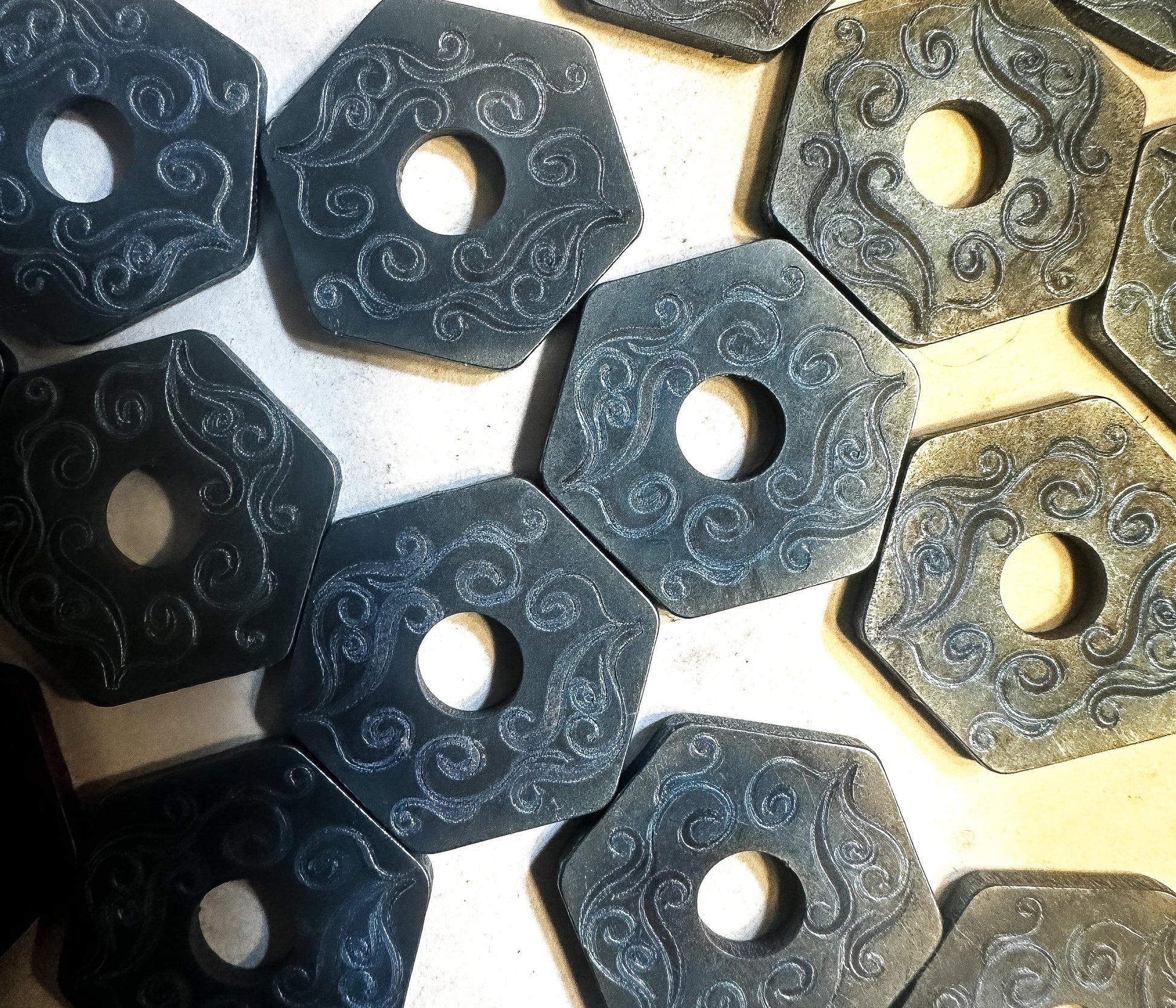 3. We weld on a hexagonal titanium guard that stops your pick from rolling off your bench.